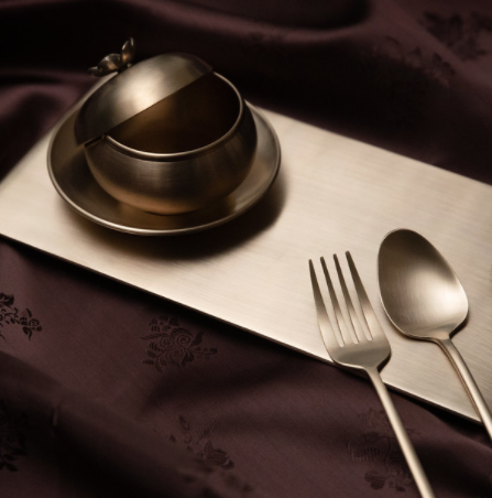 鍮器(유기)是以人工親手鑄造而成的韓國傳統高級餐具,在過去是用於盛裝韓國皇室宮廷膳食的器具,現在則常用於外國高級官員和首腦訪韓時的重要用餐場合中。鍮器具優良的保暖降溫效果,亦能抗菌,因此餐點能長時間保持新鮮,非常適合COVID-19疫情時代。