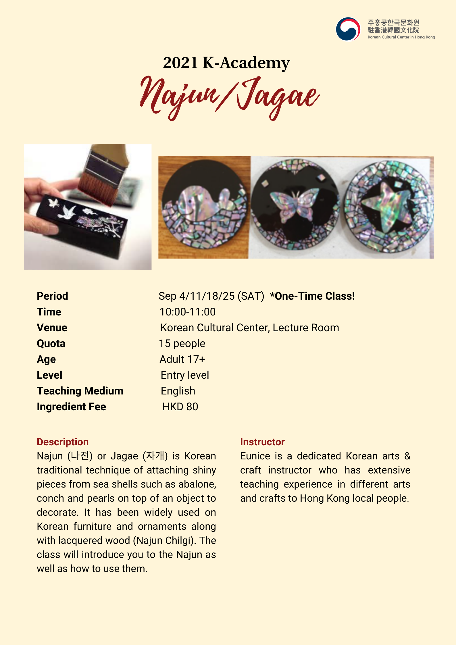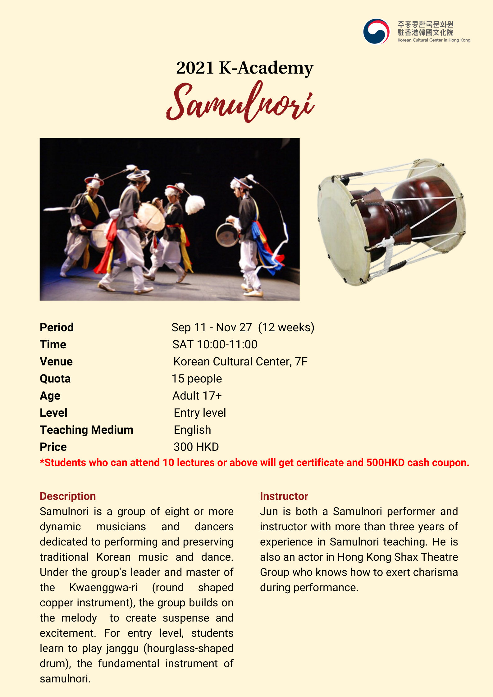 -You may register for both academy. Please note that Samulnori Academy is a 12-weeks academy, please ensure you can attend all lectures before registration. Najun Academy is a ONE-TIME class, you can only choose one date to participate.