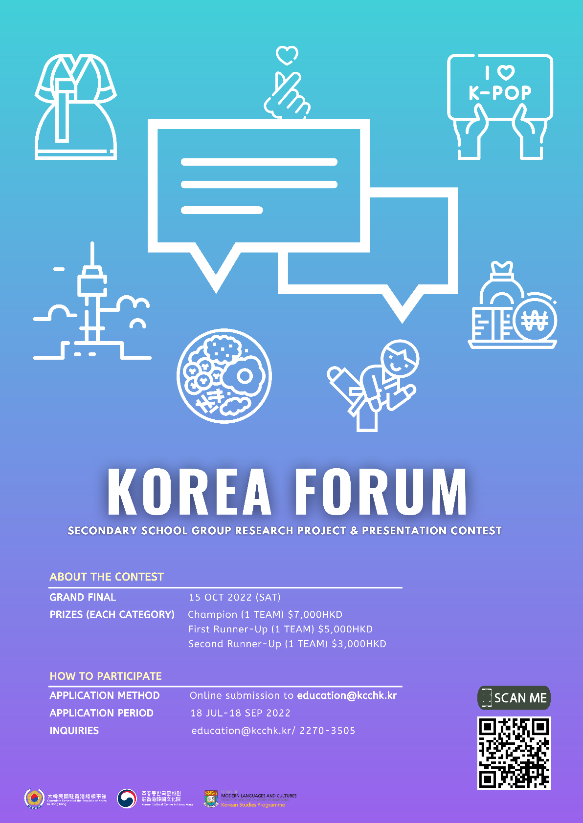 Korea Forum 2022 中學生專題研習成果簡報發表大賽 駐香港韓國文化院希望透過是次活動提高本地中學生對韓國不同範疇及領域的興趣和了解,同時爲他們提供與同齡人討論及分享韓國相關議題的平台。同學可選擇自己感興趣的主題,並與其他同學合作進行發表。詳情請參閱文化院內公告。 |