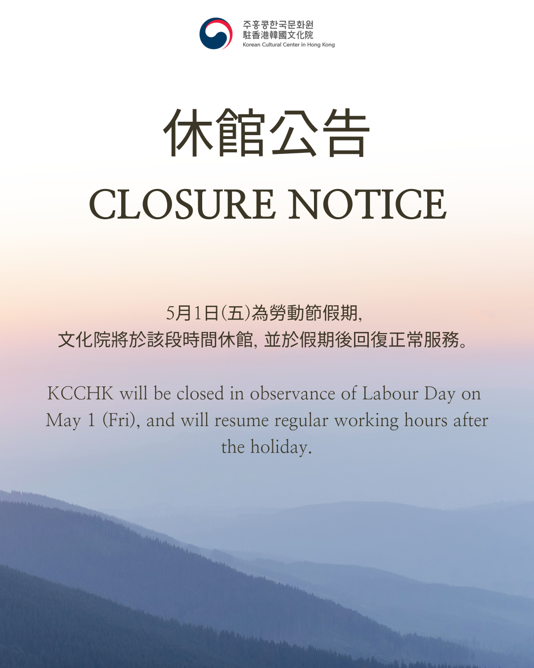 KCCHK will be closed in observance of Labour Day on May 1 (Fri), and will resume regular working hours after the holiday.