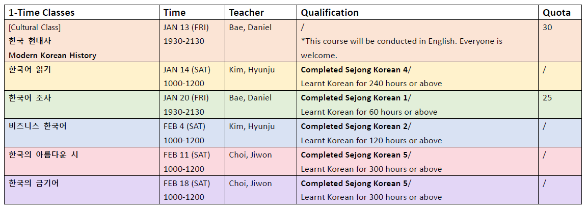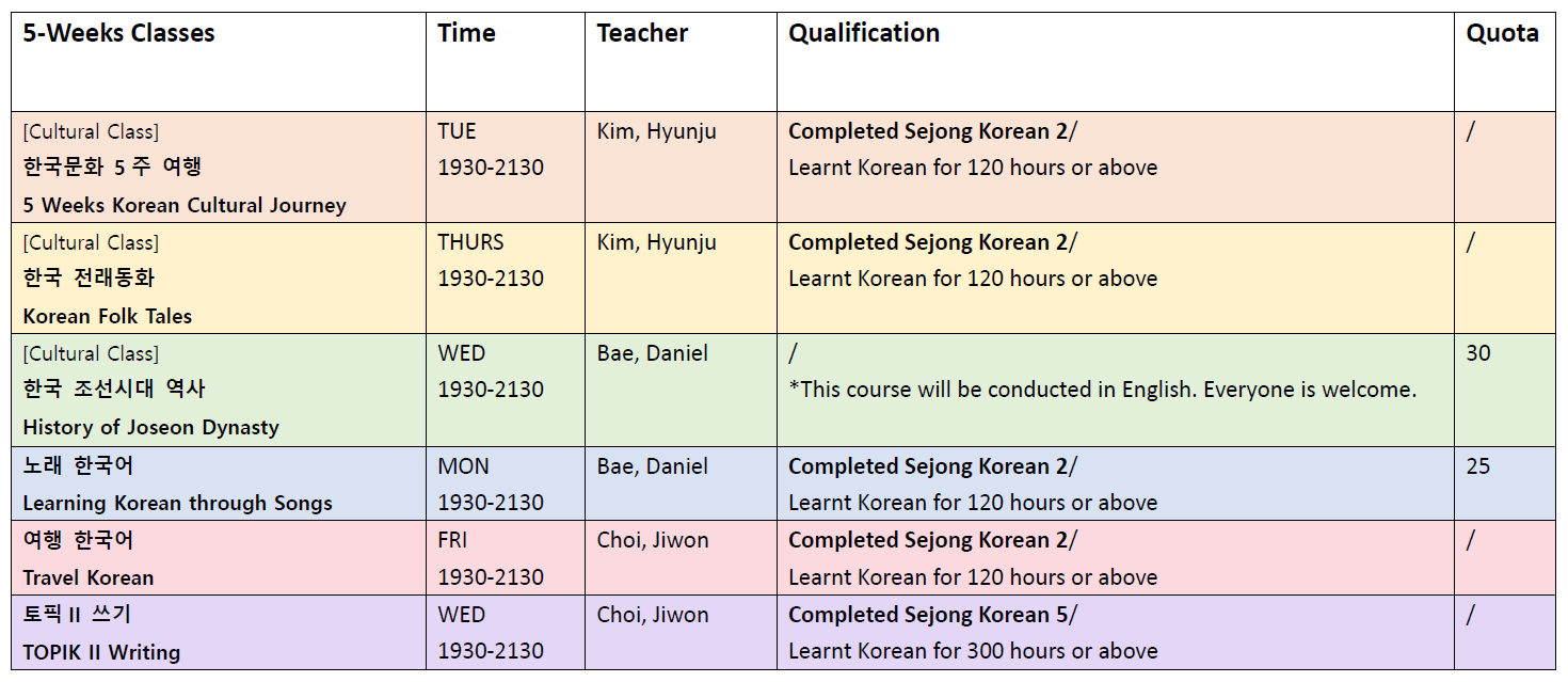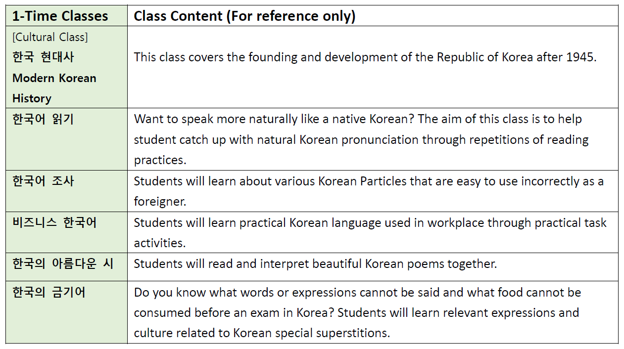 A: 本學期是特別學期,只有2個用英語進行的文化課程 (History of Joseon dynasty, modern Korean history) 適合初學者。如想從頭學習韓文,請留意2023年2月中旬開放報名的春季學期韓文課程。