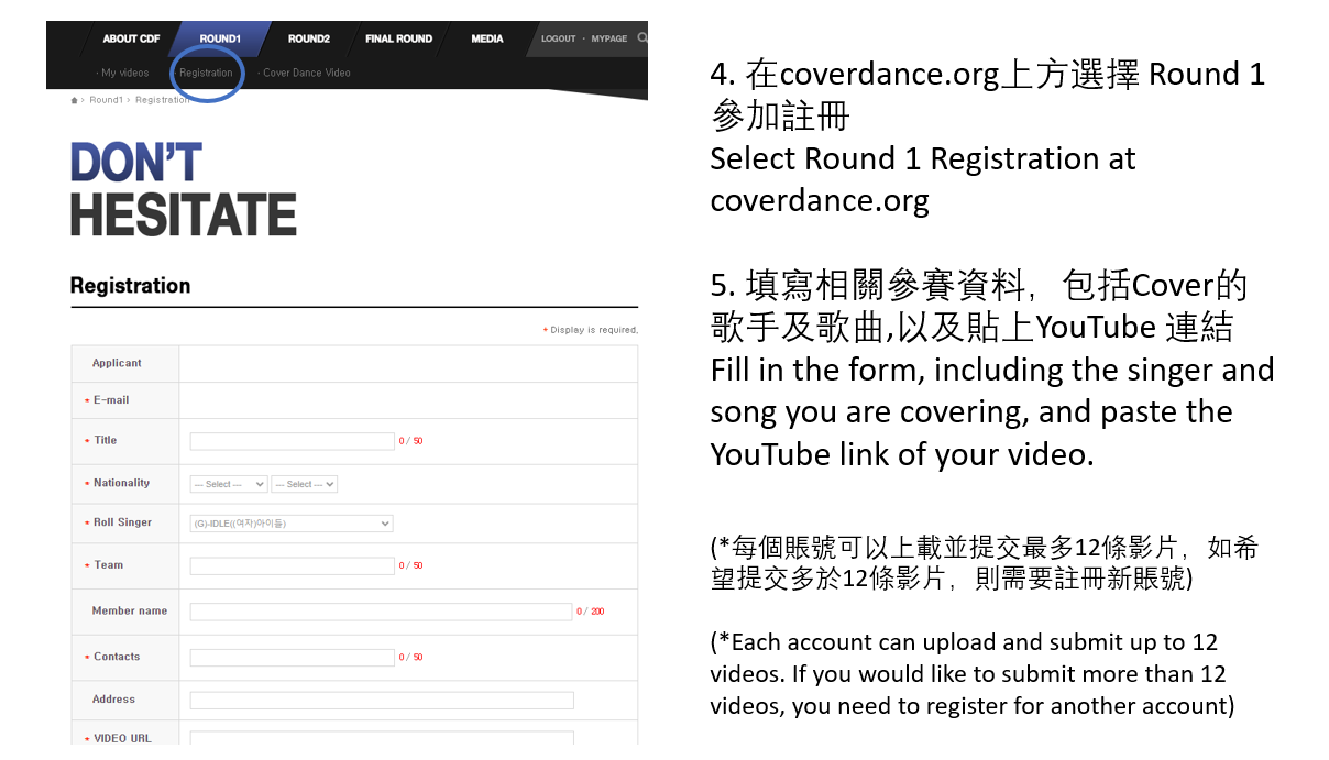 4. 回到coverdance.org,在頂欄選擇「ROUND 1- 參加注冊」 ,並填寫報名表