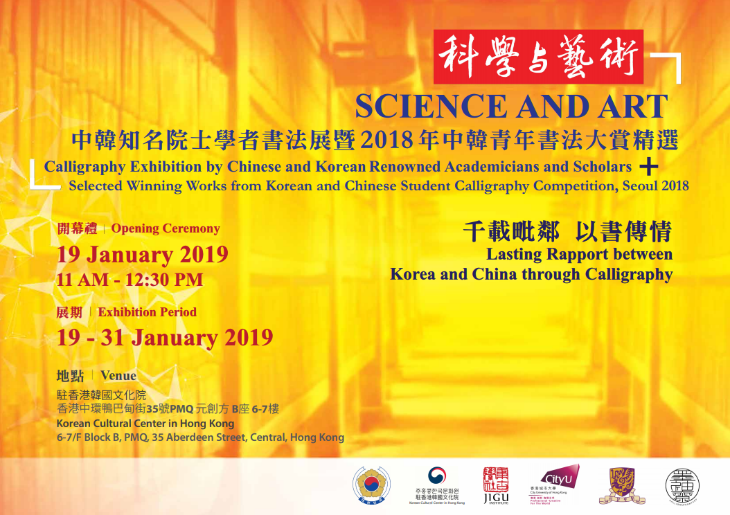 駐香港韓國文化院聯同城市大學將於1月19至31日於文化院舉辦《科學與藝術》展覽, 展出中韓知名院士學者及2018年中韓青年書法大賞中得獎學生的書法作品。今次展覽希望參與學生在準備這些書法時, 通過閱讀韓國和中國的經典文學了解中韓學術交流的歷史背景, 同時希望提高大眾對中國古代韓國學者的認識。