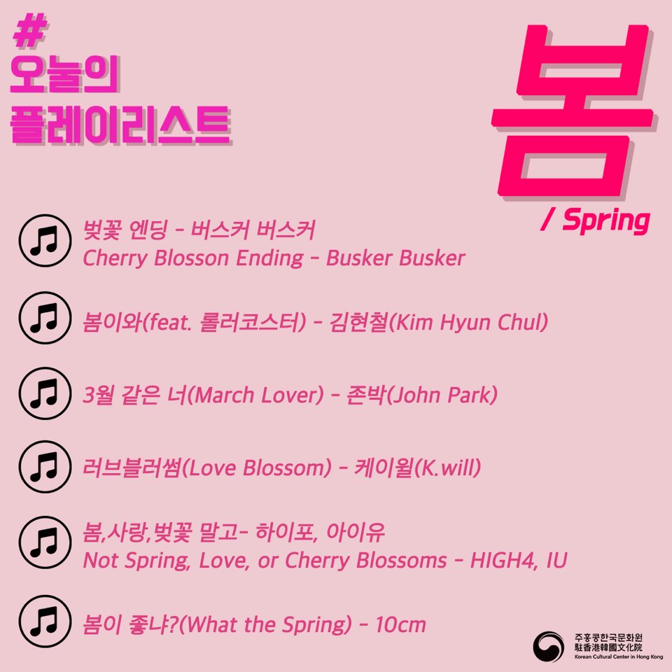 春天的感覺愈來愈強烈,為大家介紹 #오늘의플레이리스트 (今日的playlist),由文化院職員推薦出各自喜愛的「春天歌曲」,一起邊聽歌、邊學韓文,感受韓國人眼中的春天!