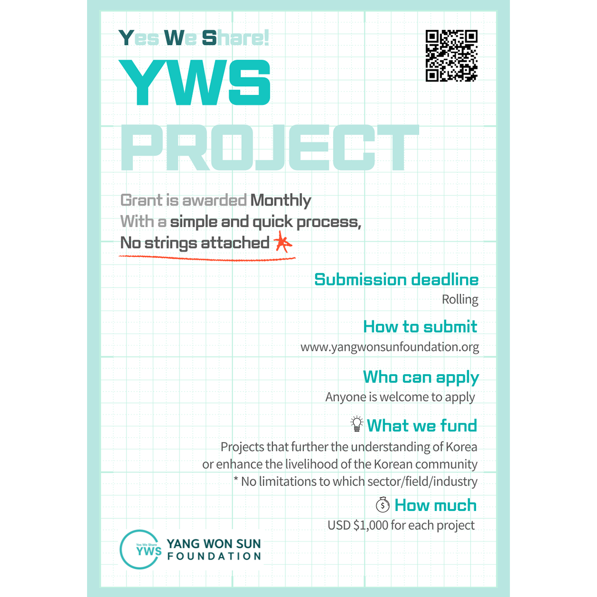 YWS PROJECT | YWS Foundation 為了進一步推廣及宣傳韓國的各種文化,Yang Won Sun Foundation推行「YWS PROJECT」, 只要有任何相關的計劃或構思,任何人也可以申請資助! |