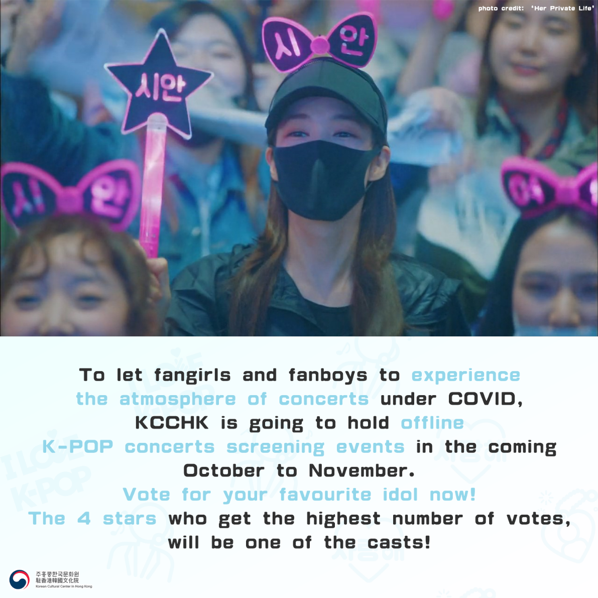 K-POP演唱會播映活動意見調查 駐香港韓國文化院計劃喺今年10月至11月,喺戲院舉辦K-POP演唱會播映活動,現正為活動進行意見調查中。如果你都想同一大班志同道合嘅粉絲一齊回味偶像嘅演唱會,就記得填寫投票表格。投票由即日起至6月30日進行,獲得最高票數嘅4組藝人,將會成為播映會嘅主角之一! |