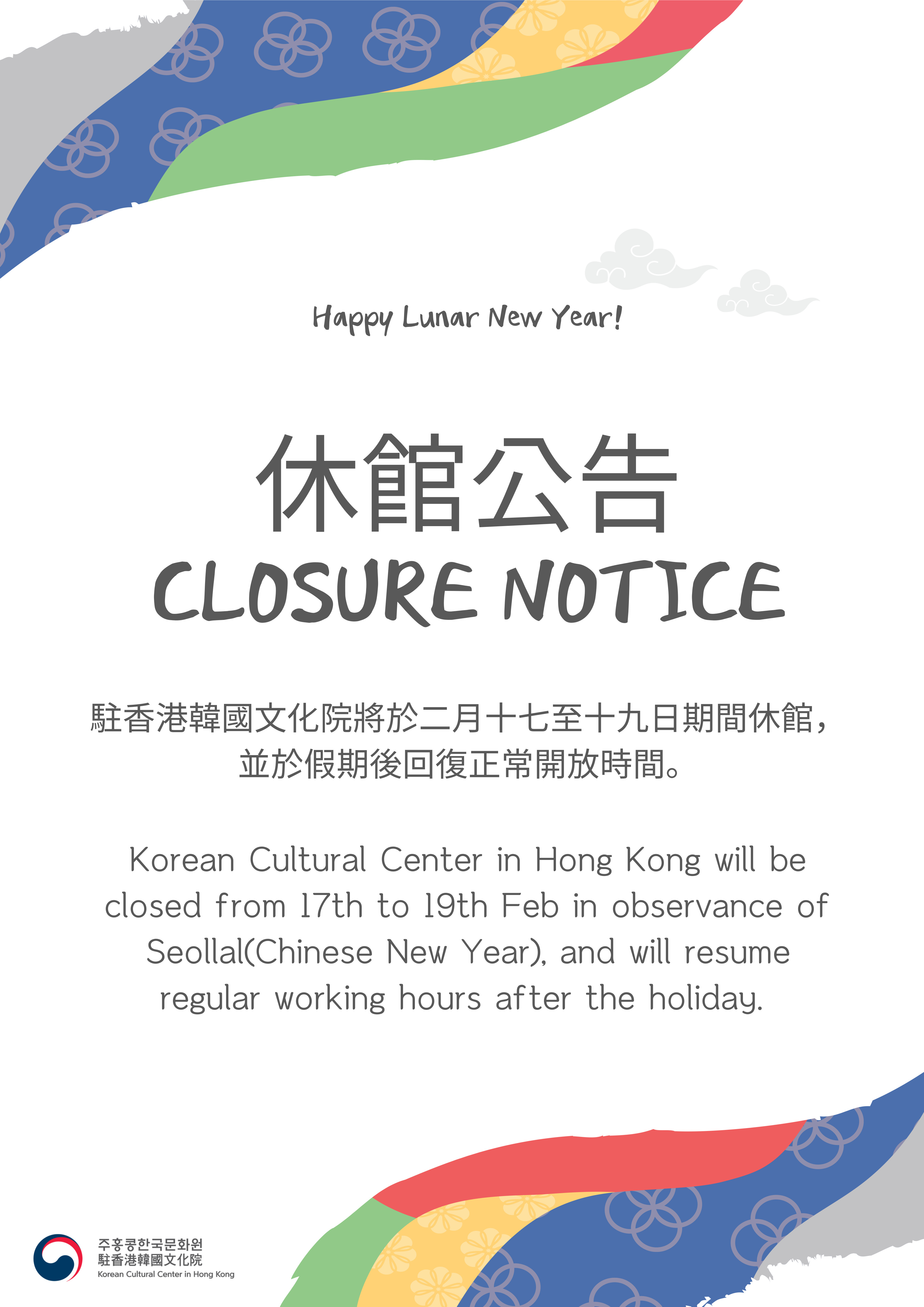 Korean Cultural Center in Hong Kong will be closed from 17th to 19th Feb in observance of Seollal(Chinese New Year), and will resume regular working hours after the holiday.