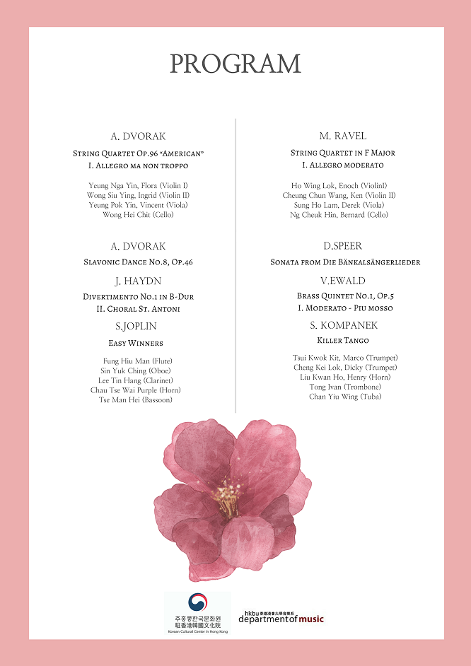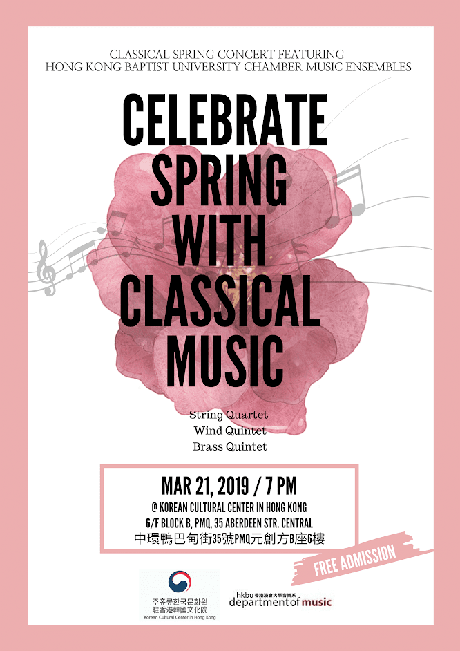 駐香港韓國文化院聯同香港浸會大學音樂系將於3月21日合辦「春季古典音樂會」, 以弦樂四重奏、木管五重奏和銅管五重奏演奏古典曲目, 迎接春季來臨。一同來文化院欣賞古典音樂, 支持浸會大學的表演者們吧!