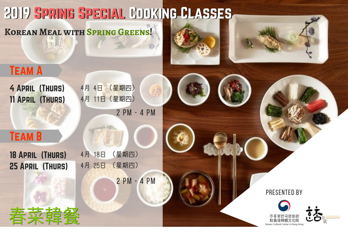 文化院將於4月重開烹飪班! 根據韓國的傳統, 韓國人會用春季的蔬菜如艾蒿、水歐芹、野韭菜等做菜以迎接春天, 所以今次烹飪班的主題為《春菜韓餐》, 希望能跟大家一起以韓國的方式慶祝春天的來臨!