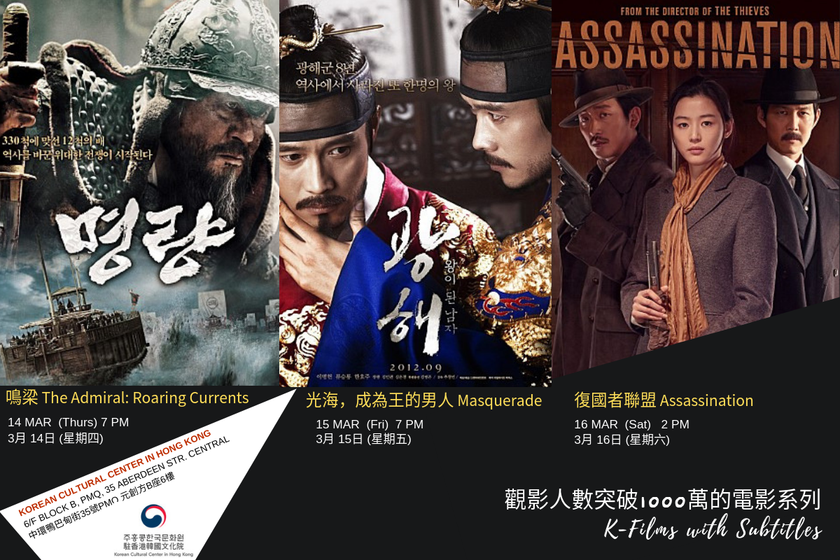文化院將於3月呈獻韓國千萬票房大電影《鳴梁》、《光海,成為王的男人》和《復國者聯盟》! 這三套電影於韓國上映後大獲好評, 文化院希望與香港市民一同分享精彩作品, 名額有限, 請勿錯過!